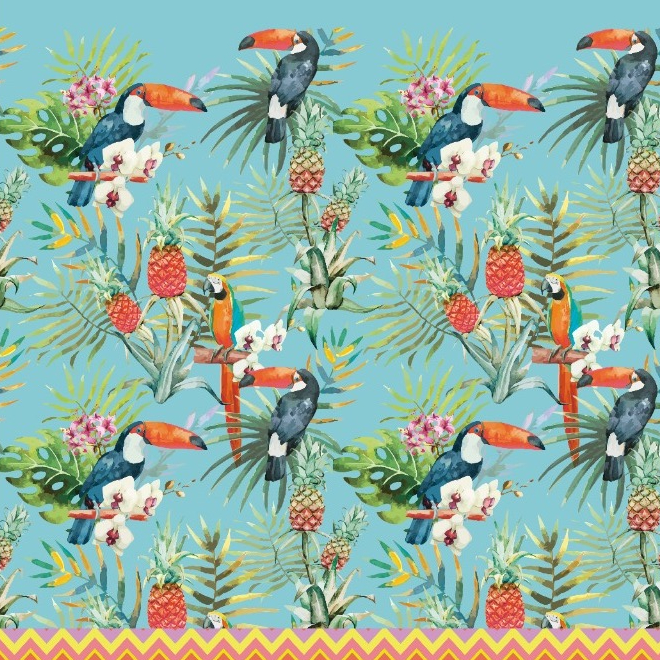 TECIDO FLUID FAARM 1 TUCANOS E BACAXIS AZUL PARA CONFECÇÃO DE VESTIDOS, SAIAS, BLUSAS, ETC